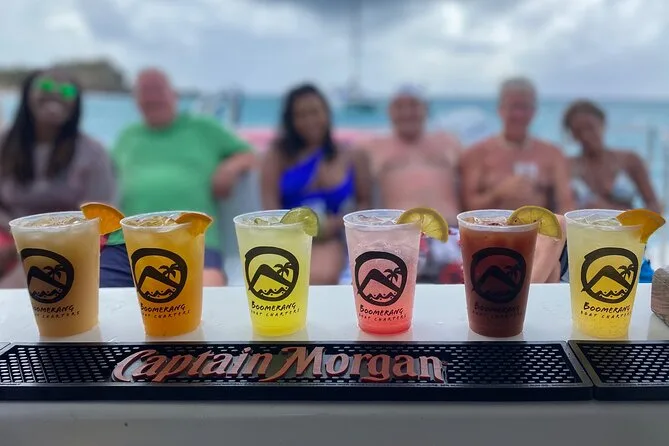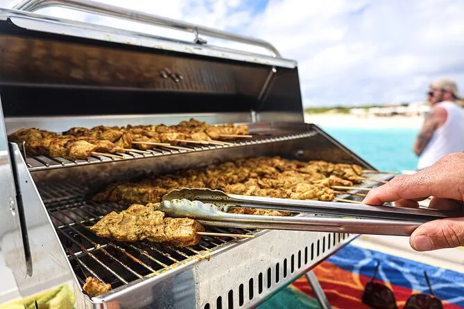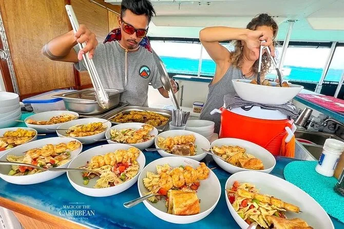 The tour includes a BBQ lunch (chicken skewers, shrimp skewers, pasta salad), tropical fruit platter, and an open bar with cocktails and soft drinks.