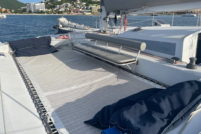 You’ll be picked up by dinghy/tender from the dock to board the trimaran in Simpson Bay.