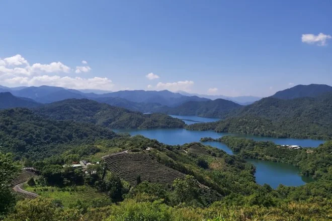 Tea fields winding over misty hills and the quiet shimmer of Thousand Island Lake near Taipei