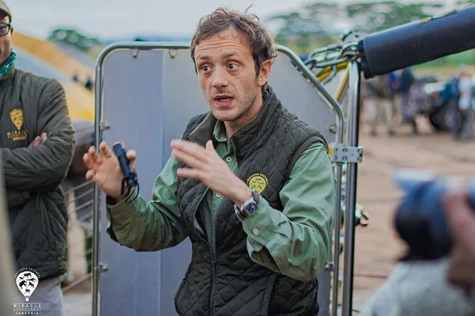 The first thing I noticed was how cold the grass felt on my ankles as we walked out in the half-dark — not what I expected from Tanzania, honestly. The launch site was already buzzing, people clutching coffee cups, faces lit by the orange flicker of burners. Our pilot, Daniel, handed me a tea (so welcome at 5:45 am) and joked about his “balloon hair” — which made everyone laugh even though none of us were fully awake yet.