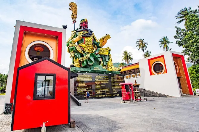 The tour visits Big Buddha Temple, Na Muang Waterfall, Wat Khunaram (mummified monk), Guan Yu Shrine, Lamai beach rocks, panoramic viewpoints, and several shrines.