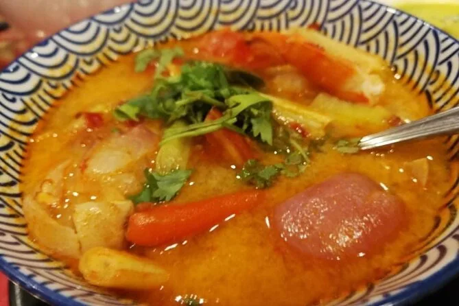 Back at the school, each person gets their own little cooking station. Mine had a slightly wobbly stool but honestly, I kind of liked it — made me pay attention. We chopped herbs for Pad Thai (my fingers still smelled like kaffir lime hours later) and pounded curry paste with mortars that felt older than me. At one point I put too much chili in my panang curry; Noi just winked and poured me more coconut milk. Lunch was what we cooked ourselves — sticky rice with mango tasted way better after all that effort. Everyone sort of lingered around the table longer than expected, swapping stories about failed recipes back home.
