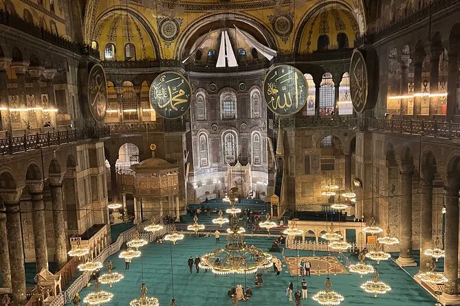 You visit Hagia Sophia, Blue Mosque, Hippodrome/Sultanahmet Square, Basilica Cistern, Topkapi Palace, and Grand Bazaar.