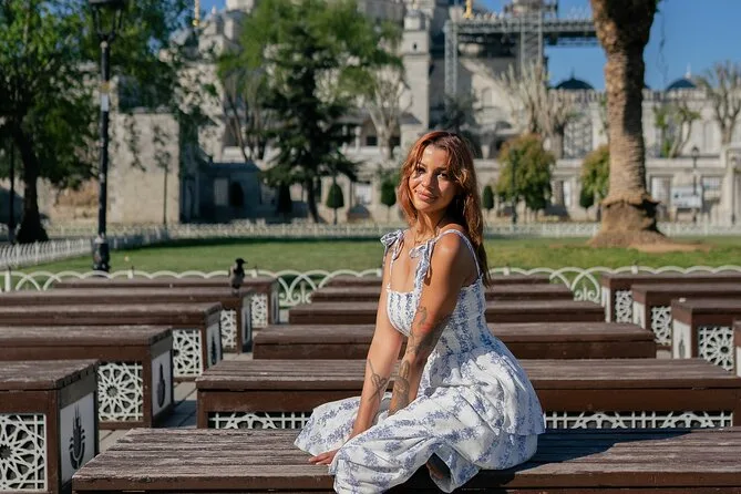 The Blue Mosque was next. Our guide suggested sitting on one of those wooden benches—the kind that’s just slightly too low if you’re tall—and snapped a few candid ones while I tried not to laugh at my own awkwardness. He kept it relaxed, nothing forced. There was this moment when the call to prayer echoed across the square and I swear everyone paused for half a second—even us. It felt weirdly special to be photographed right then, like we were part of something bigger than just a day trip photoshoot in Istanbul.
