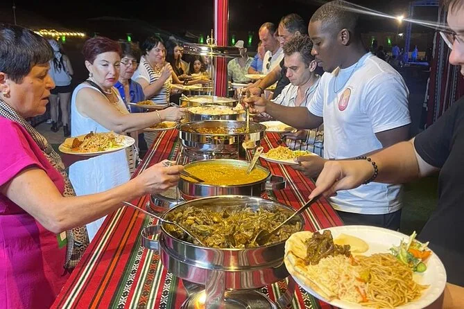 A hot barbecue dinner is served along with starter food, Arabic coffee, tea, dates, water and soft drinks.