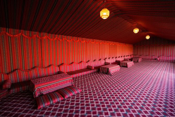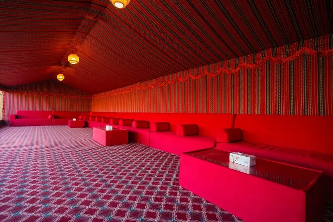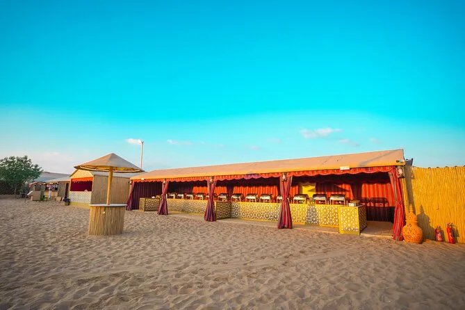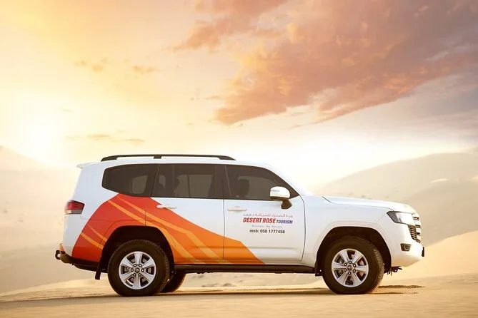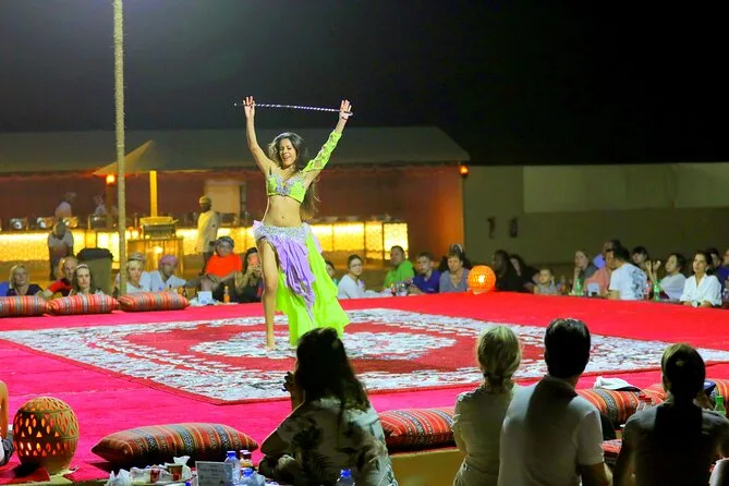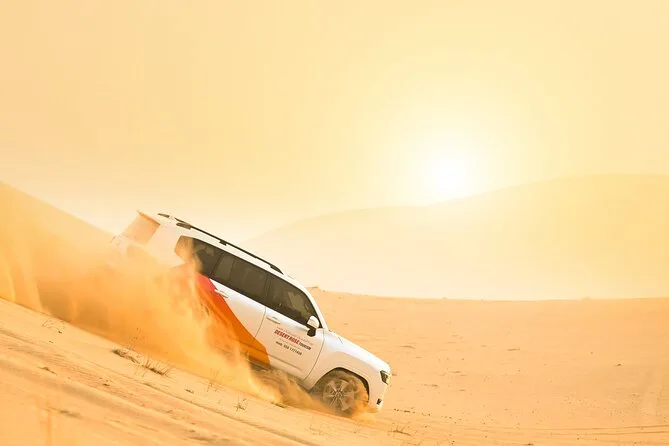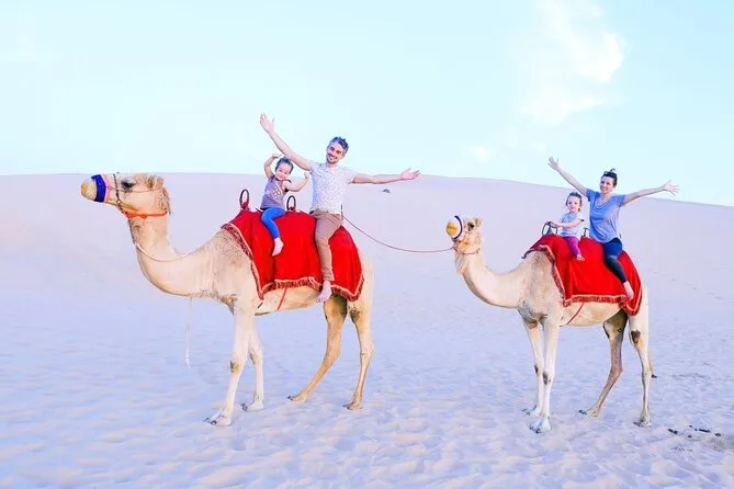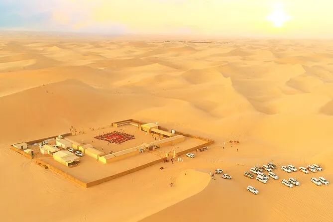 Your half-day includes pickup from your Abu Dhabi hotel or cruise terminal by local driver-guide before heading into the dunes for sand bashing fun. You’ll visit a camel farm for photos and short rides then continue to a desert camp with sand boarding opportunities. At camp enjoy unlimited tea or coffee plus water and soft drinks alongside a full BBQ buffet dinner with salads and local dishes before being driven back to your starting point in comfort.