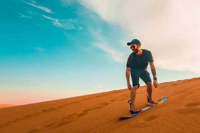 Your morning includes air-conditioned 4x4 transport with pickup and drop-off at your chosen hotel or location in Abu Dhabi city center or cruise port. You’ll get guided dune bashing (about 30-40 minutes), time to try sandboarding with help if needed, a short camel ride near Etihad Towers area, plus bottled mineral water along the way before returning by midday.