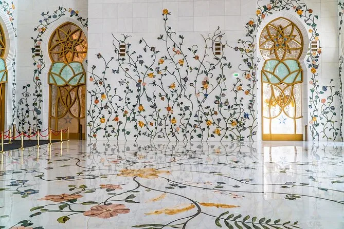 Your day includes hotel pickup and drop-off in an air-conditioned vehicle from Dubai or Abu Dhabi hotels, all entry fees to sites like BAPS Hindu Mandir (unless Monday), House of Artisans and art gallery visits, guided stops at key landmarks including Emirates Palace for photos, plus plenty of free time for lunch at Marina Mall before returning in the evening.