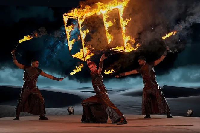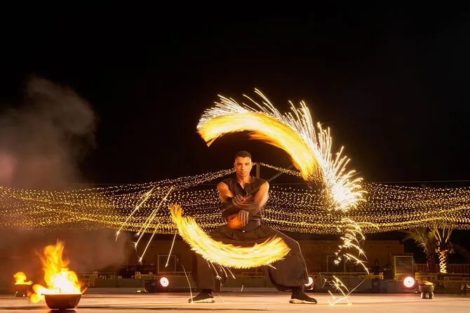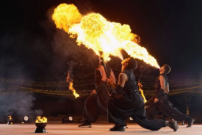 Your evening includes exclusive pickup and drop-off by private Land Cruiser or Nissan Patrol from your hotel in Dubai, an exhilarating 45-minute dune bashing session led by a certified English-speaking guide, entry to Noble Camp with access to camel rides (including feeding baby camels), sandboarding fun and henna tattoo painting if you want it. Enjoy unlimited soft drinks—or choose optional alcoholic packages—and settle into Gold or Platinum seating for a four-course VIP set menu prepared by a 5-star chef while watching nine unique live performances before heading back under starry skies.