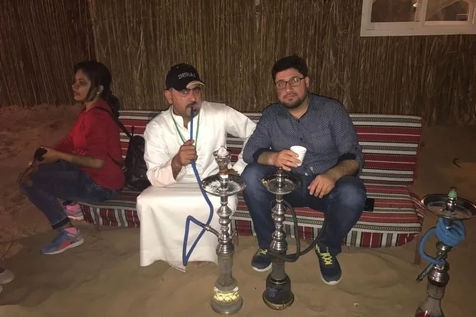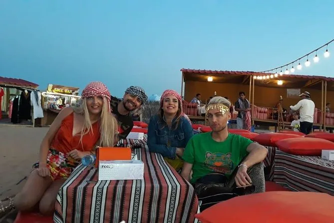 At camp, things got lively fast. We were welcomed with dates and tiny cups of Arabic coffee — bitter but somehow perfect after all that dust. There was henna painting (I got a lopsided flower on my hand), shisha smoke curling up under string lights, and music starting up as people found their seats for dinner. The BBQ buffet had grilled chicken that tasted smoky-sweet; I still think about those flatbreads fresh off the fire. The Tanoura dancer spun so long I got dizzy just watching him, and during the fire show someone’s toddler tried to copy the moves with a glow stick — pretty sure nobody minded.
