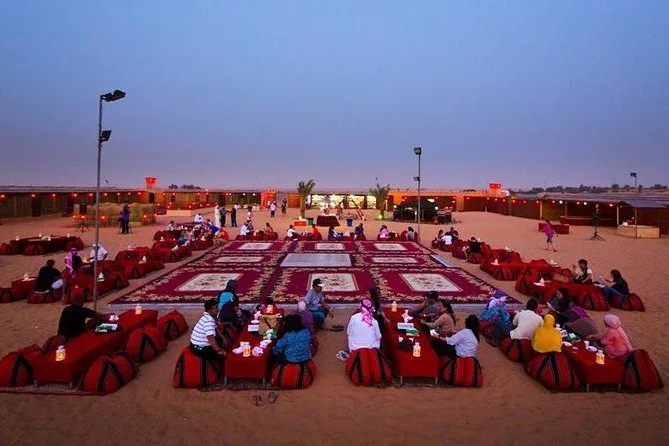 Your evening includes private hotel pickup by English-speaking guide in a 4x4 Land Cruiser, short camel ride (with longer treks available), optional quad biking or buggy rides (extra charge), dune bashing with sandboarding stop if you want it, unlimited refreshments at camp plus Arabic coffee and dates on arrival, traditional henna painting for women, shisha lounge access, live entertainment shows like belly dance and fire show (seasonal), plus a full BBQ buffet dinner before heading back to your hotel late evening.