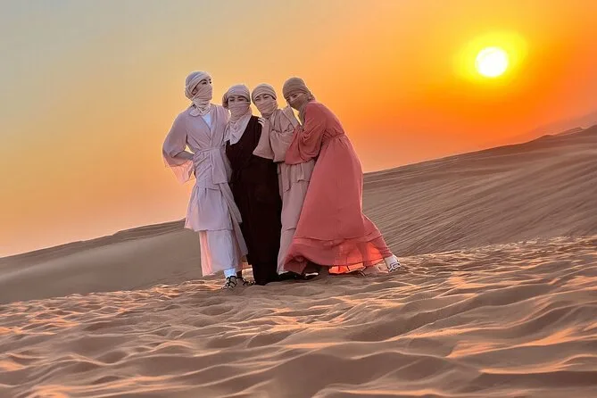 Your day includes private 4x4 pickup from anywhere in Dubai (hotel or port), red dune bashing for about forty minutes plus sandboarding time and sunset stop; camel ride and falcon photo opportunity; entry to a premium desert camp where you’re welcomed with Arabic coffee and dates; henna tattoos by local artists; unlimited soft drinks; shisha lounge access; chance to dress up in traditional attire; full BBQ buffet dinner; plus live belly dance, Tanoura spinning show, fire performance — then drop-off back to your location late evening.
