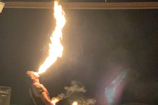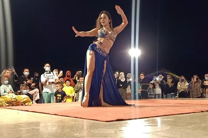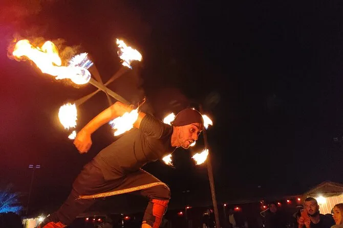 The evening features belly dancing, Tanoura spinning dance, and a fire show at camp.