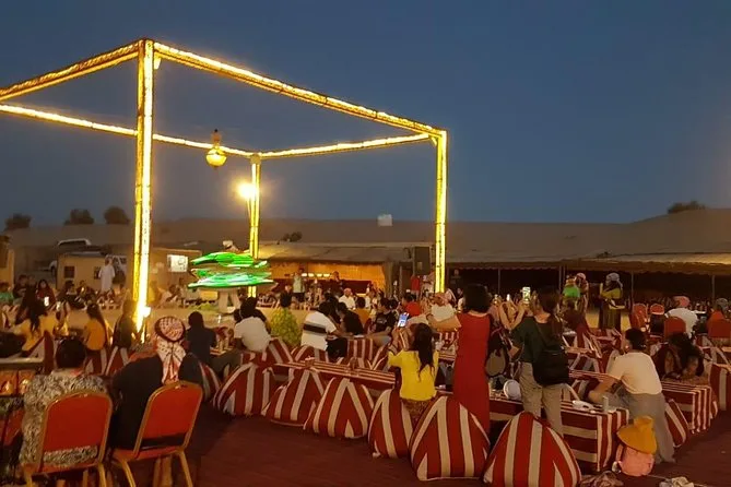 At camp, they handed us little cups of gahwa and sweet dates before anything else. The air smelled like grilled lamb and something floral from the shisha lounge nearby. There were these low cushions everywhere — I nearly tripped over one trying to get henna done (the artist laughed and fixed my smudge). The belly dancer winked at our table during her set; later there was this wild spinning Tanoura show that made me dizzy just watching. Dinner was a blur of smoky kebabs and cold salads — nothing fancy but somehow perfect after all that sand.