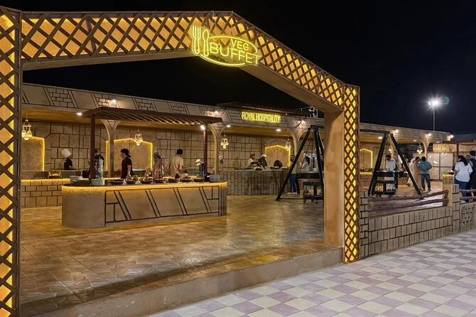 Yes, there is a lavish BBQ buffet dinner with vegetarian and non-vegetarian options at the camp.