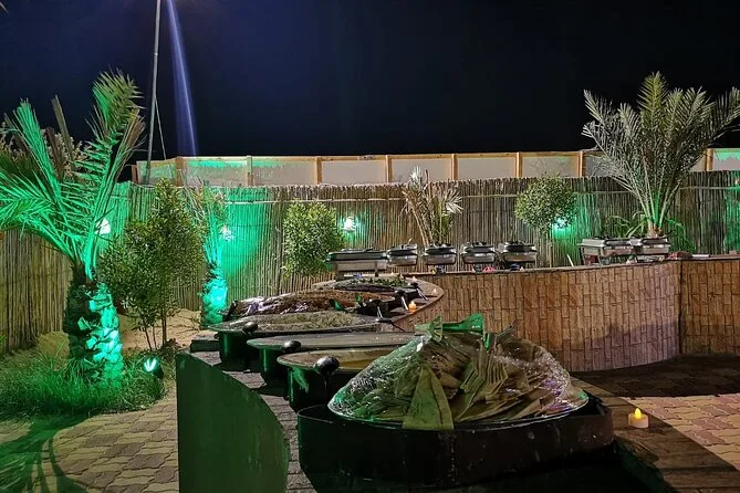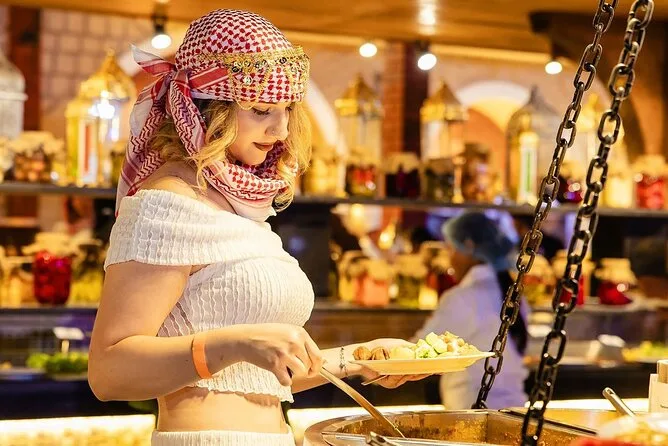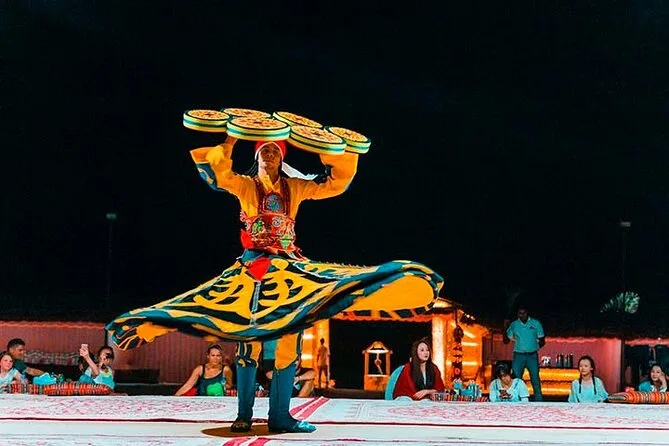 The tour also includes dune bashing in a 4x4, sandboarding, camel riding, henna painting (for ladies and kids), live dance shows, fire show, and shisha smoking for adults.