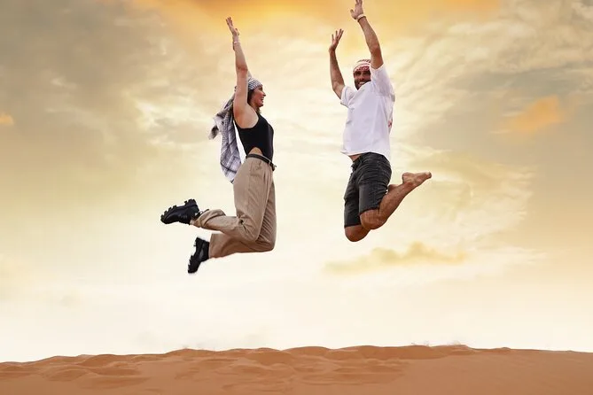 The tour includes dune bashing, sandboarding, a short camel ride, sunset photo stop, and optional camp activities like henna painting and shisha.
