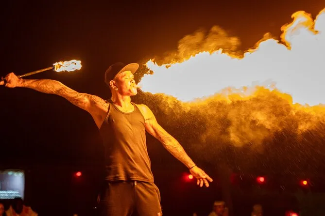 Your day includes hotel pickup and drop-off by licensed guide in a 4x4 vehicle; bottled water throughout; all equipment needed for dune bashing and sandboarding; a short camel ride; sunset photo stops; plus access to Bedouin-style camp activities such as henna painting, shisha area use (with extras available), falcon interaction (seasonal), live shows like Tanura dance or fire show if you stay for dinner—and a full BBQ buffet with vegetarian options before heading back to your hotel relaxed (and probably sandy).