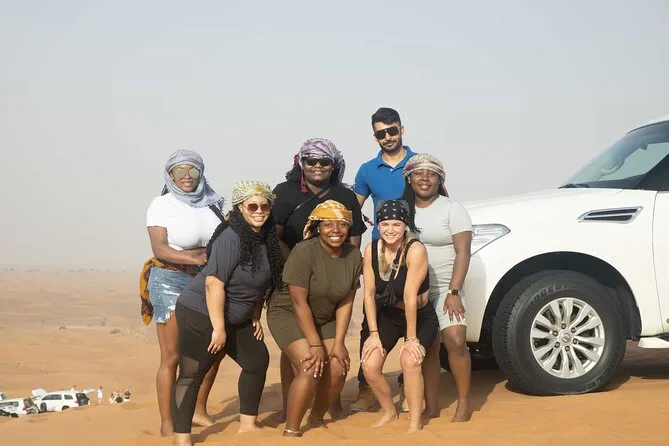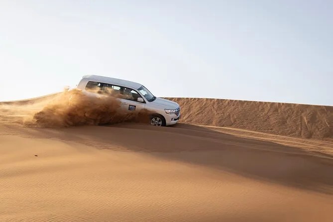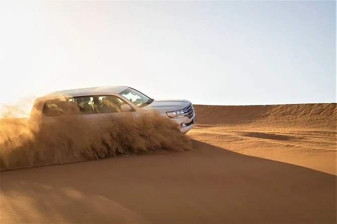Your morning includes hotel pickup in an air-conditioned Land Cruiser, plenty of cold mineral water or soft drinks along the way, about 30–40 minutes of dune bashing led by a licensed English-speaking guide, time to try sandboarding on gentle slopes (with help if you want), photos holding a falcon handled by a local trainer, plus an easygoing camel ride before returning to your hotel in Dubai City.