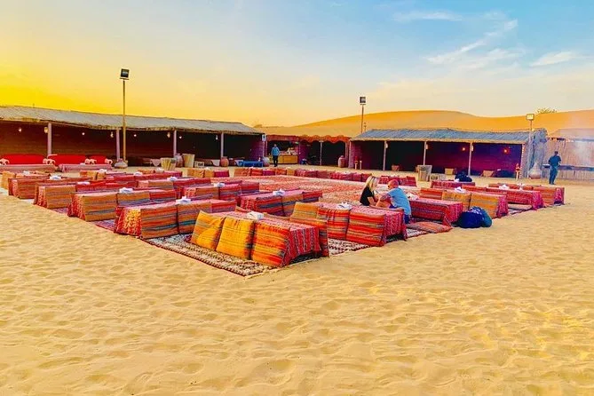 Your day includes shared hotel pickup by 4x4 from anywhere in Dubai out to Lahbab’s red dunes for quad biking, sandboarding, dune bashing with a skilled driver, and a short camel ride—all guided by locals. At sunset you’ll be welcomed into a premium desert camp for a BBQ buffet dinner with live dance shows plus options like henna painting and traditional dress photos before heading back to your hotel that night.