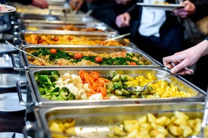 A BBQ buffet dinner with grilled meats, salads, and traditional dishes is served at camp.