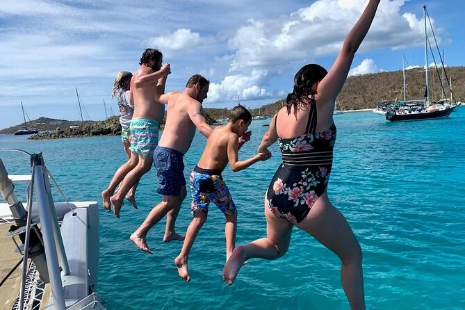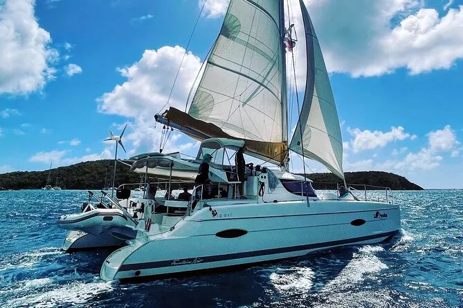 Your day includes sailing on a semi-private catamaran with Coast Guard certified local crew members guiding you across Pillsbury Sound from St. Thomas; use of snorkeling gear; cheese or pepperoni pizza lunch delivered by Pizza Pi's boat; open bar with light snacks; champagne toast at sunset; restroom facilities onboard; plus all captain and fuel costs covered before returning in the evening.