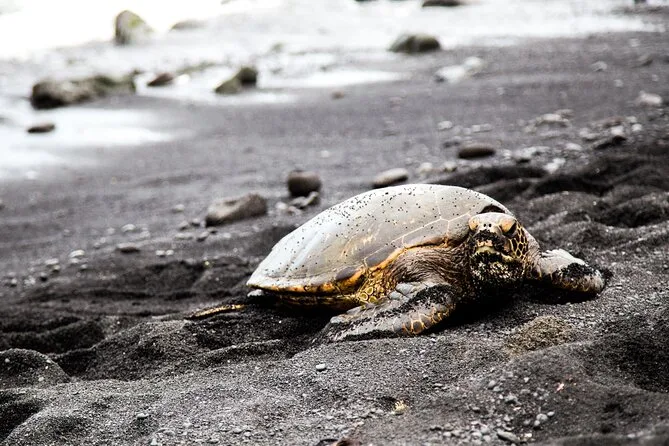 Yes, you’ll stop at Punaluʻu Black Sand Beach to walk on the unique sand and look for turtles.
