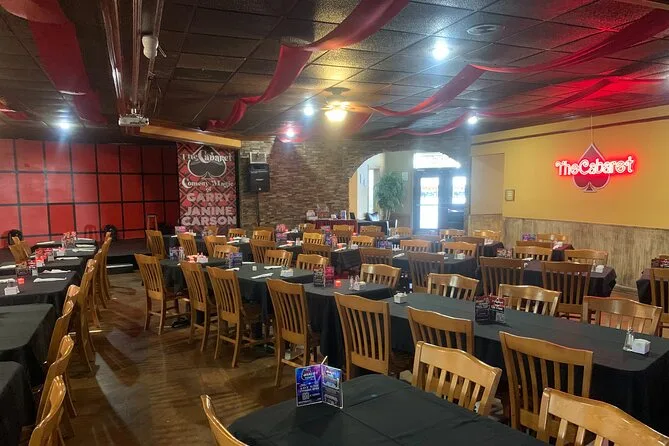 Your evening includes entry to The Cabaret on Shepherd Of The Hills Expressway with a buffet-style dinner served before Garry & Janine Carson’s interactive magic and comedy performance. Show tickets cover both your meal and entertainment in an accessible venue fit for families or groups of any age.