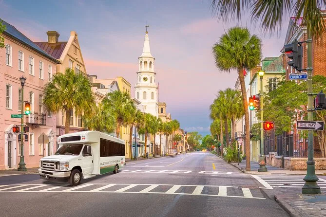 The tour includes stops at The Battery & White Point Garden, Rainbow Row, City Market, downtown historic area, and The Citadel campus.