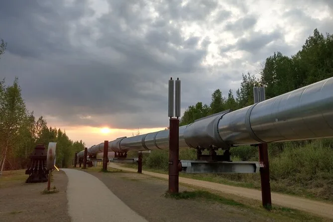 The tour includes stops at the Trans-Alaska Pipeline Viewpoint, Morris Thompson Cultural and Visitors Center, University of Alaska Museum of the North, and Santa Claus House in North Pole.