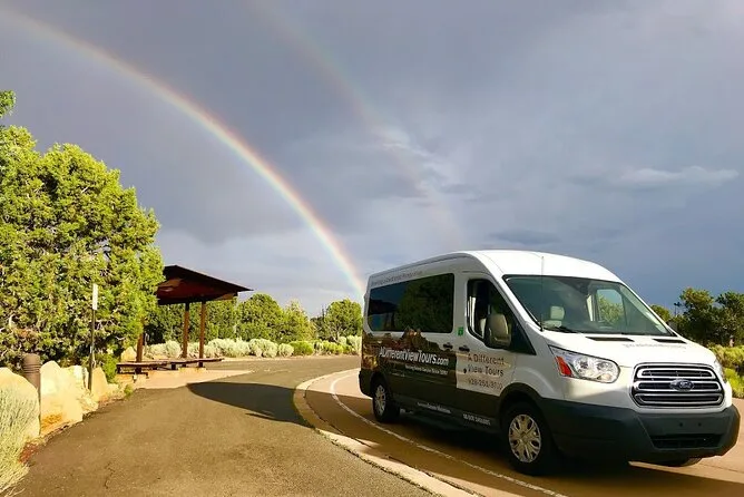Your afternoon includes meeting your group inside Grand Canyon park with easy pickup at the Visitor Center flagpole; comfortable rides between South Rim overlooks; bottled water ready when you need it; umbrellas if rain threatens; binoculars for those far-off river views; cozy blankets if evening gets cool; plus plenty of time listening to your local guide’s stories before returning to your car after sunset.