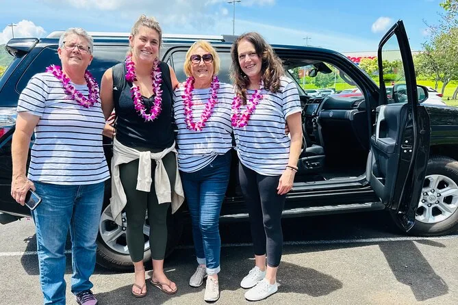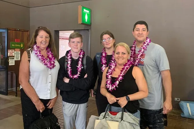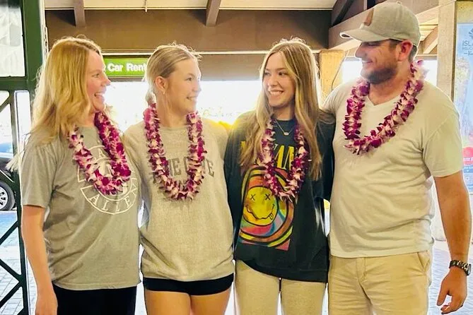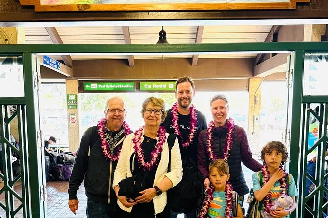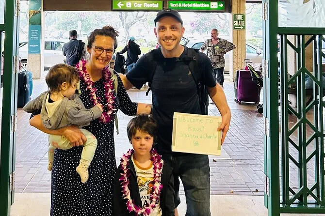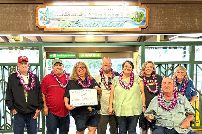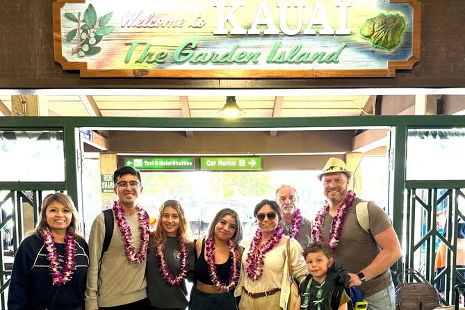 Your arrival includes a fresh orchid flower lei—or kukui nut or candy lei depending on preference—a souvenir photo taken with your own phone or camera right at Lihue Airport, plus accessibility for wheelchairs and families with strollers or prams.