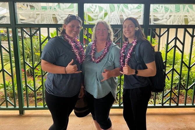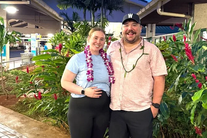 The woman who greeted us (I think her name was Malia?) had this way of making everyone feel seen—she even crouched down to tie a candy lei for the kid next to me, who grinned like he’d won the lottery. My partner got a kukui nut lei and kept turning it over in his hands; he said it felt smooth and heavier than he expected. We snapped a quick photo on my phone—my hair was wild from the flight but I didn’t care. It’s still one of my favorite pictures from the trip.