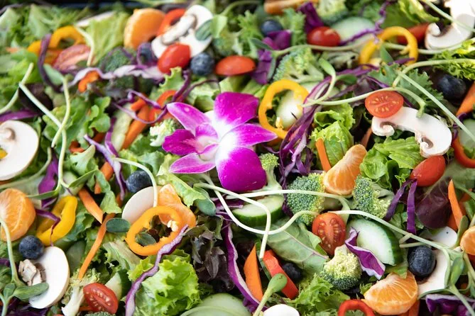 The menu includes mixed green salad, pasta salad, teriyaki chicken, kalua pig & cabbage, stir-fried veggies with tofu, rice, and dessert.