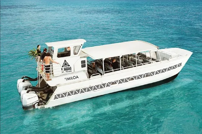 Your afternoon includes use of snorkeling gear with expert instructions if you need them (plus noodles or lifejackets for extra float), all soft drinks plus beer, wine and Mai Tais at the open bar (with ID), a casual island-style taco buffet dinner with dessert served barefoot on deck as you sail past waterfalls and sea cliffs—guided by local crew aboard a certified catamaran from Port Allen.