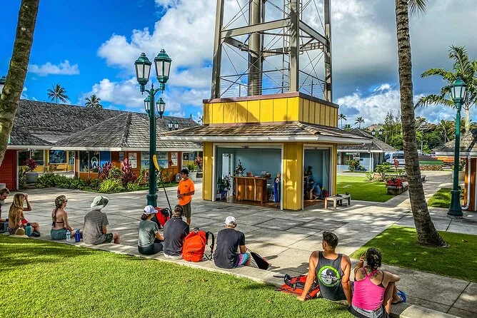 You check in at Coconut Marketplace beneath the water tower on Kauai.