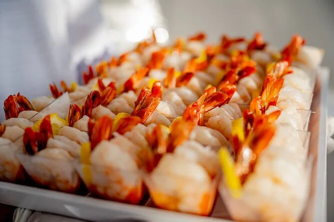 Yes, chef’s hors d’oeuvres are served onboard including shrimp cocktail and other small bites.