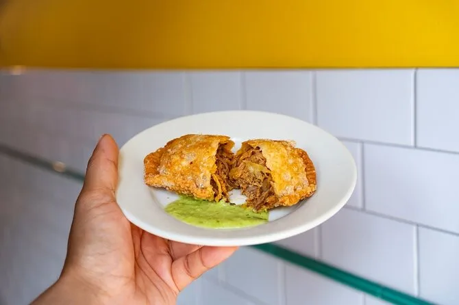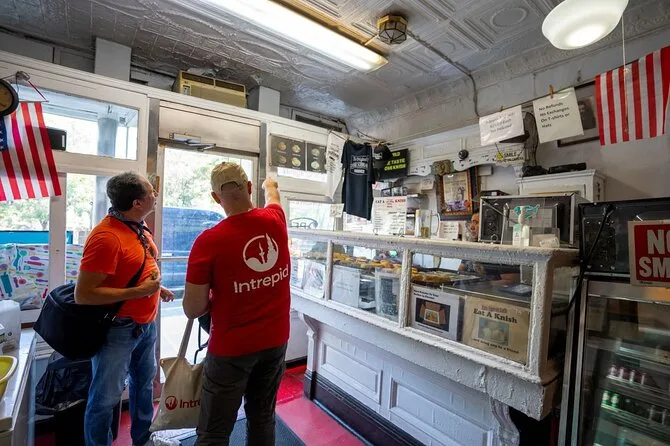 You sample four historic dishes such as dumplings, pizza, knish, and empanada from local shops.