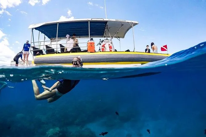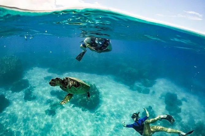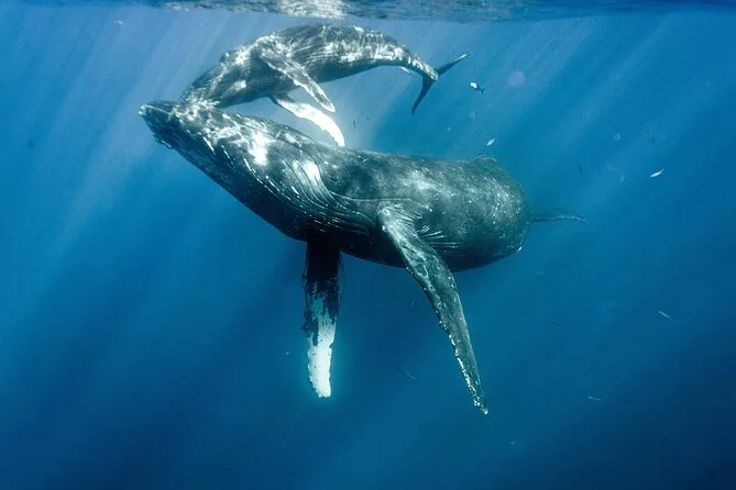 The tour lasts approximately 4 hours including two snorkel stops or one stop plus whale watching during migration season.