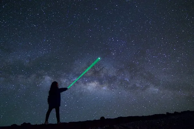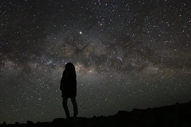 Your day includes pickup in a 4x4 van, jackets and gloves for warmth at high altitude, snacks plus a hot drink while stargazing through a professional telescope (weather permitting), stories from your experienced local guide, and astrophotography portraits emailed to you after your visit before heading back down late in the evening.