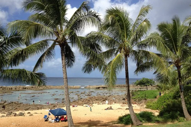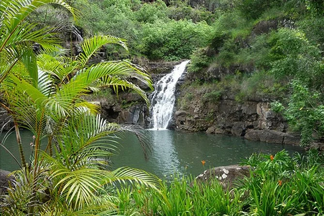 The tour lasts a full day with multiple stops around Oahu including Waimea Falls and Haleiwa town.