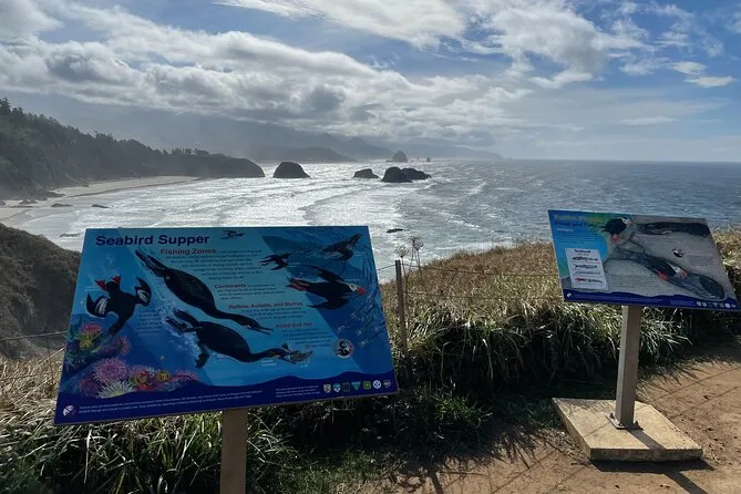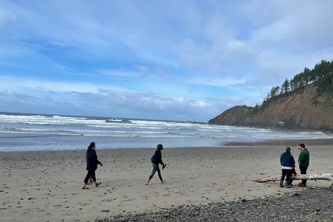 The itinerary aims for low tide so guests can explore tide pools around Haystack Rock when possible.