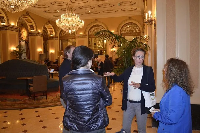 You’ll step inside select locations like hotel lobbies or courtyards when possible; some sites are viewed from outside.
