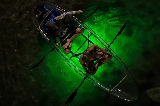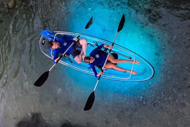 Your tour includes all kayaking equipment (clear tandem kayak, paddles, seats), safety gear, bug spray, dry bag, and underwater glow lights.