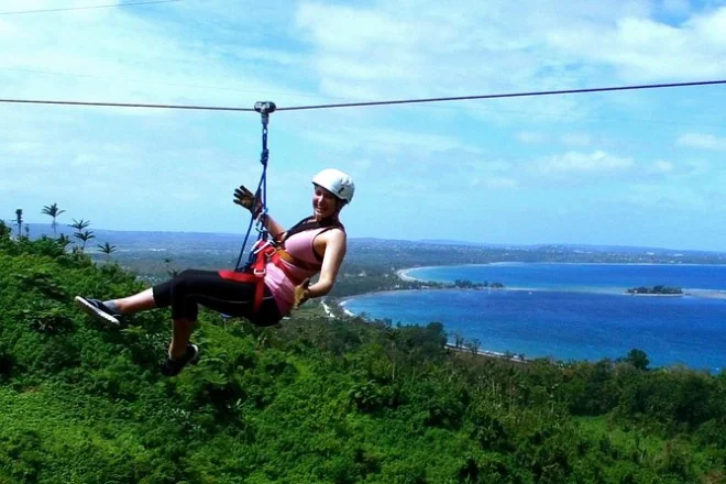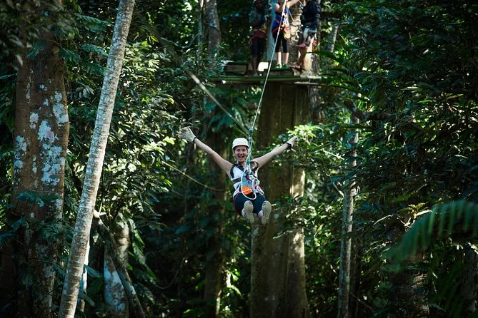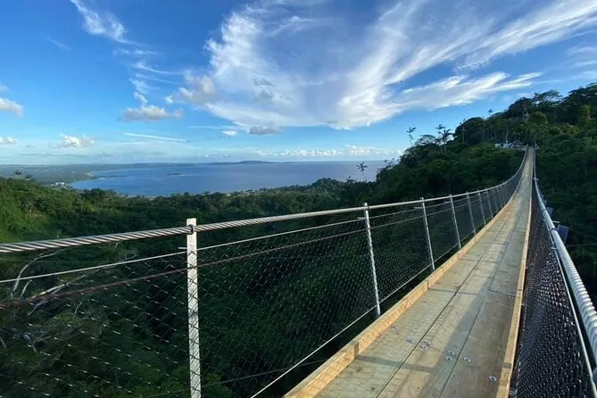 After a few more zips — each one longer or higher than the last — we came to the Skybridge. It’s 180 meters long and honestly it moves more than you’d expect. The metal grates rattled under our boots while someone behind me joked about not looking down (I looked anyway). There was this moment halfway across where everything went quiet except for distant waves and some kid giggling behind me. Sunlight flickered through palm leaves onto the bridge and for a second it felt like floating. Not sure why that sticks with me.