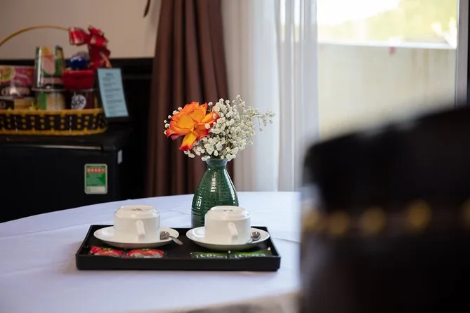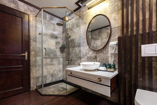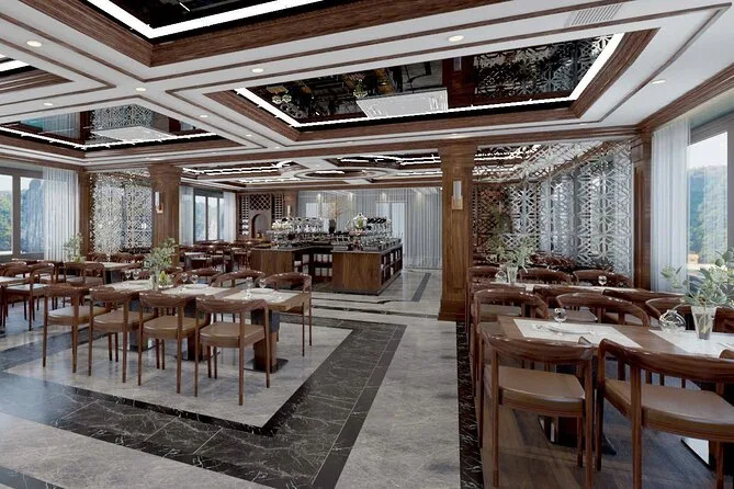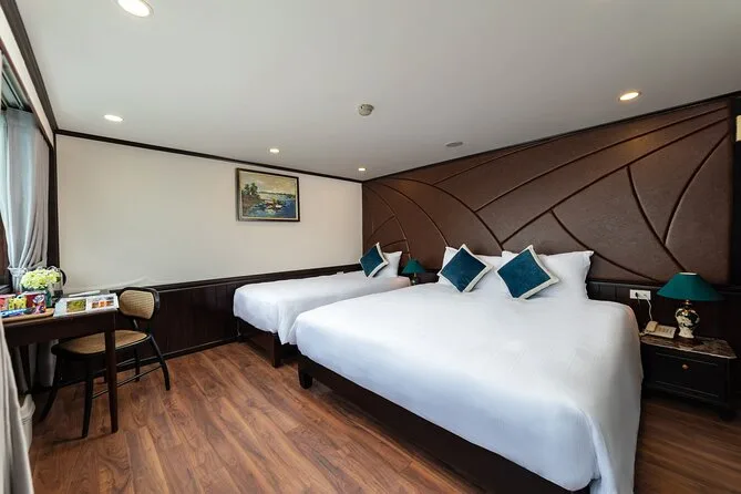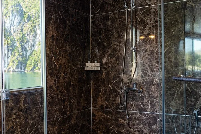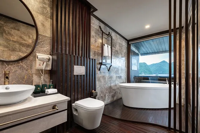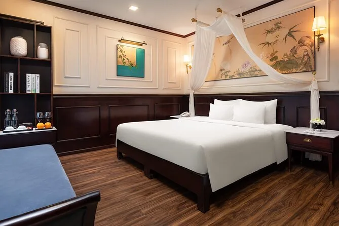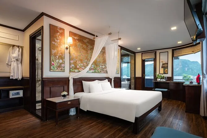 Your journey includes roundtrip shuttle bus transfers between Hanoi Old Quarter and Ha Long Bay pier; all entrance fees for caves and islands; kayaking or bamboo boat rides; swimming stops; an overnight stay in an en-suite cabin with sea views; plus breakfast, lunch, dinner onboard—alongside extras like sunset cocktails, a cooking class demo, tai chi session in the morning light, and help from your friendly English-speaking guide throughout.