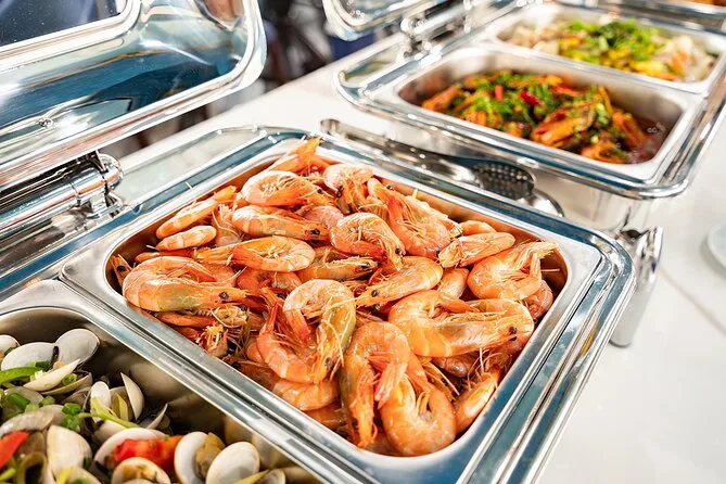 A buffet lunch is served featuring seafood, Vietnamese dishes, vegetarian options, and fresh fruit.