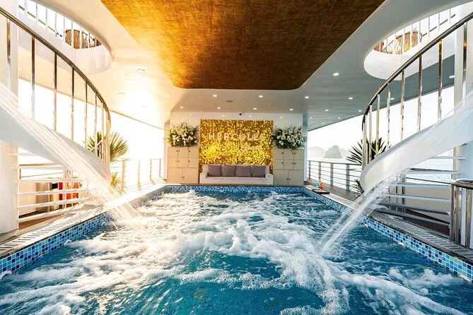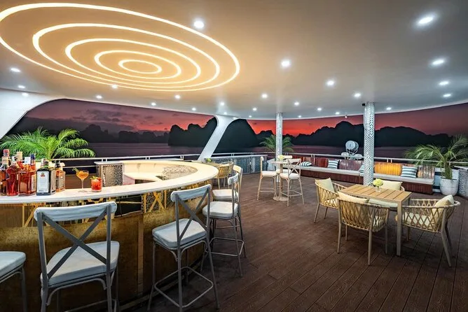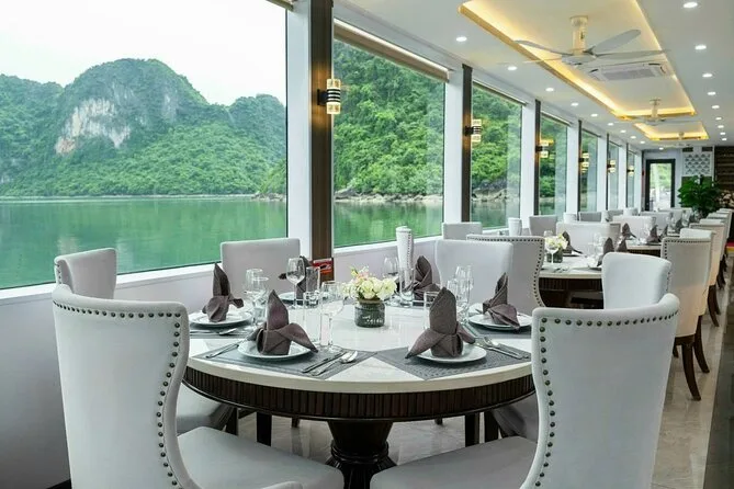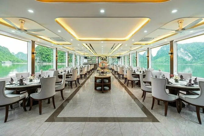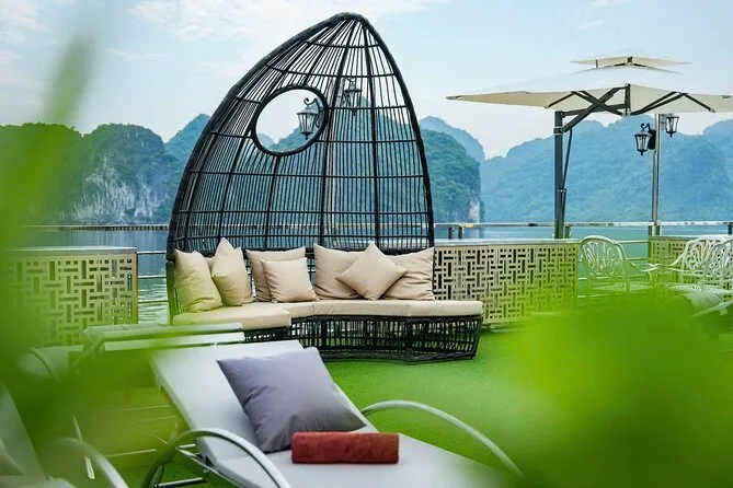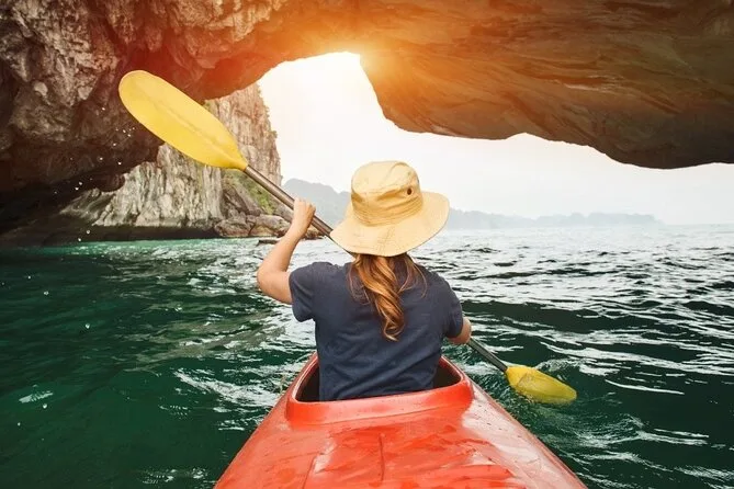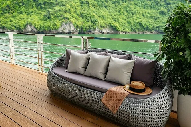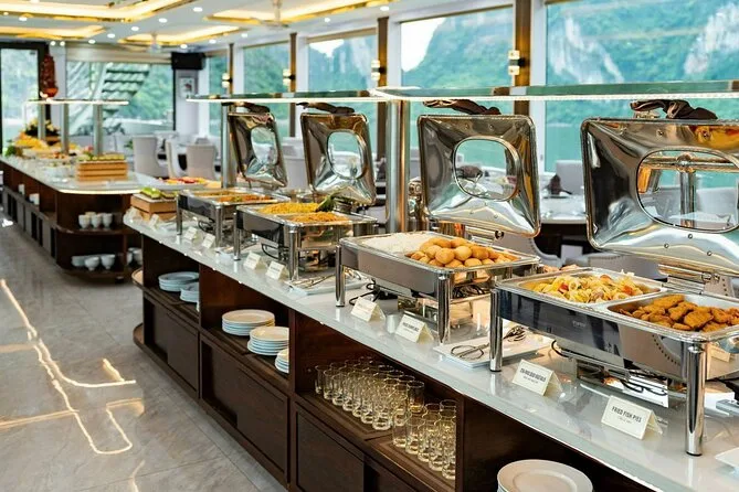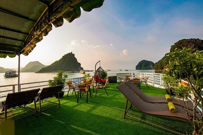 Your day includes hotel pickup and drop-off in Hanoi Old Quarter, all entry fees for caves and islands along Halong Bay, bottled water throughout, your choice of kayaking or bamboo boat ride at Luon Cave area, a traditional Vietnamese seafood lunch (with vegetarian options), plus a relaxed sunset party with fruit and wine before heading back to Hanoi in an air-conditioned vehicle.