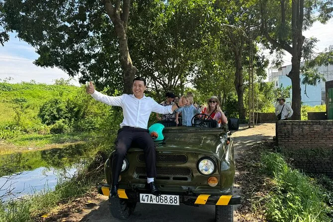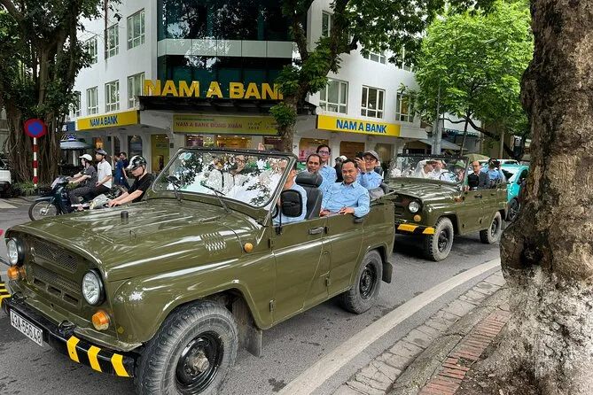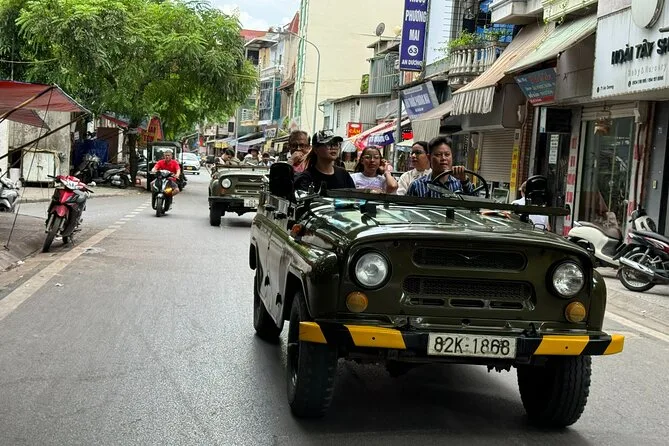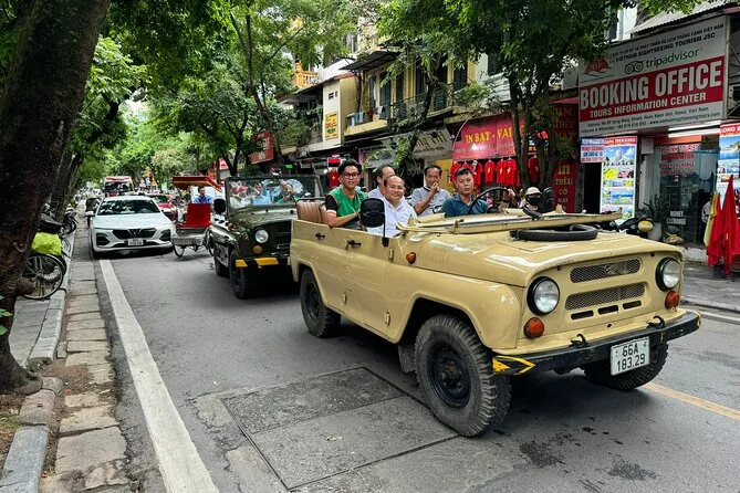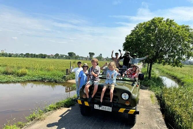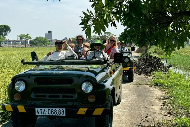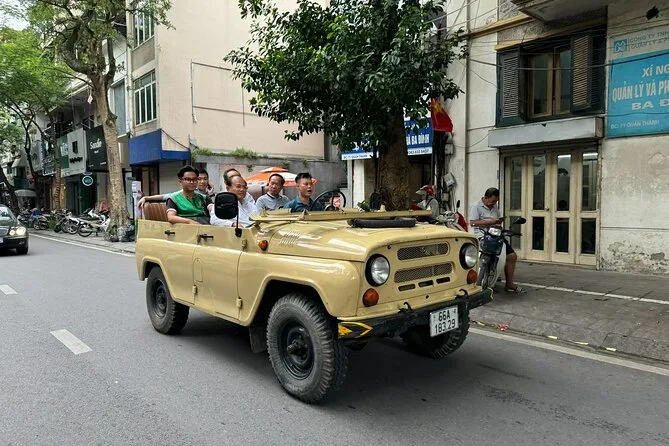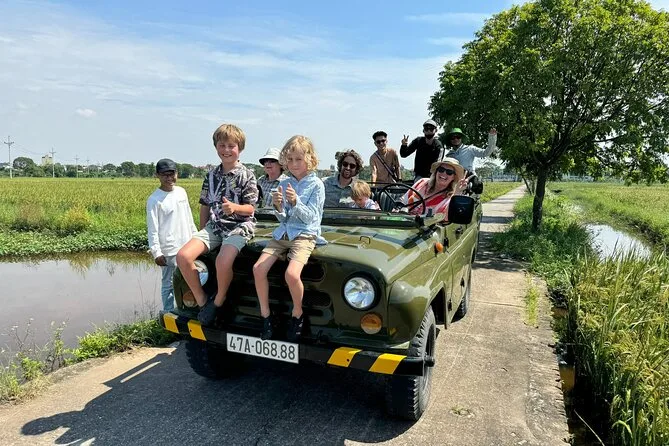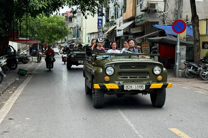 Your day includes hotel pickup and drop-off by open-air army jeep with an experienced driver, all entrance fees covered along the route, visits to key sites like West Lake and B52 Lake plus time with a local family on Red River Island, an authentic lunch at a neighborhood restaurant (with plenty of fresh herbs), bottled water during your journey, English-speaking guide throughout—and yes, egg coffee by Train Street before heading back to your hotel.
