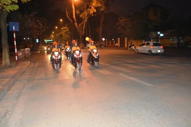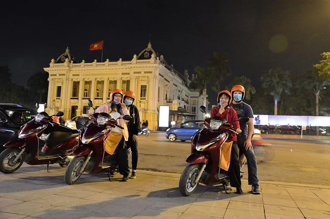 Your evening includes hotel pickup and drop-off (or meeting at Hanoi Opera House), all food tastings from Banh Cuon to dessert, drinks including egg coffee or tea, comfortable Honda Lead scooters with passenger backrests driven by mainly female guides, sanitized helmets plus face-masks and raincoats if needed—so you don’t have to worry about anything except enjoying each bite and view along the way.